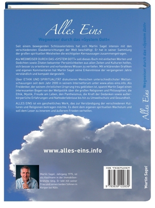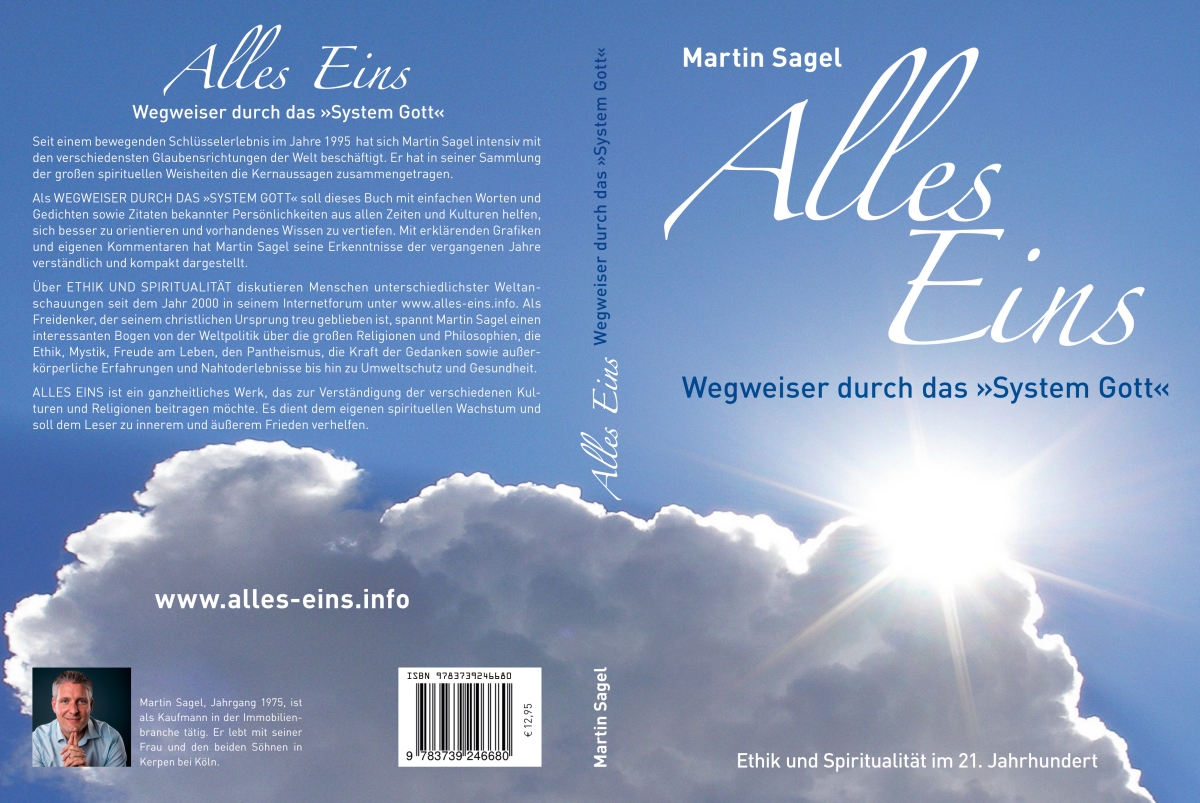 Über ETHIK UND SPIRITUALITÄT diskutieren Menschen unterschiedlichster Weltanschauungen seit dem Jahr 2000 in seinem Internetforum unter www.alles-eins.info. Als Freidenker, der seinem christlichen Ursprung treu geblieben ist, spannt Martin Sagel einen interessanten Bogen von der Weltpolitik über die großen Religionen und Philosophien, die Ethik, Mystik, Freude am Leben, den Pantheismus, die Kraft der Gedanken sowie außerkörperliche Erfahrungen und Nahtoderlebnisse bis hin zu Umweltschutz und Gesundheit.