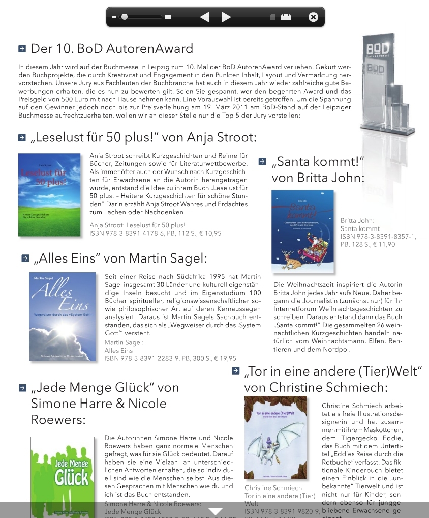 siehe dazu das BoD-Aktuell-Magazin aus dem Frühjahr 2011 HIER